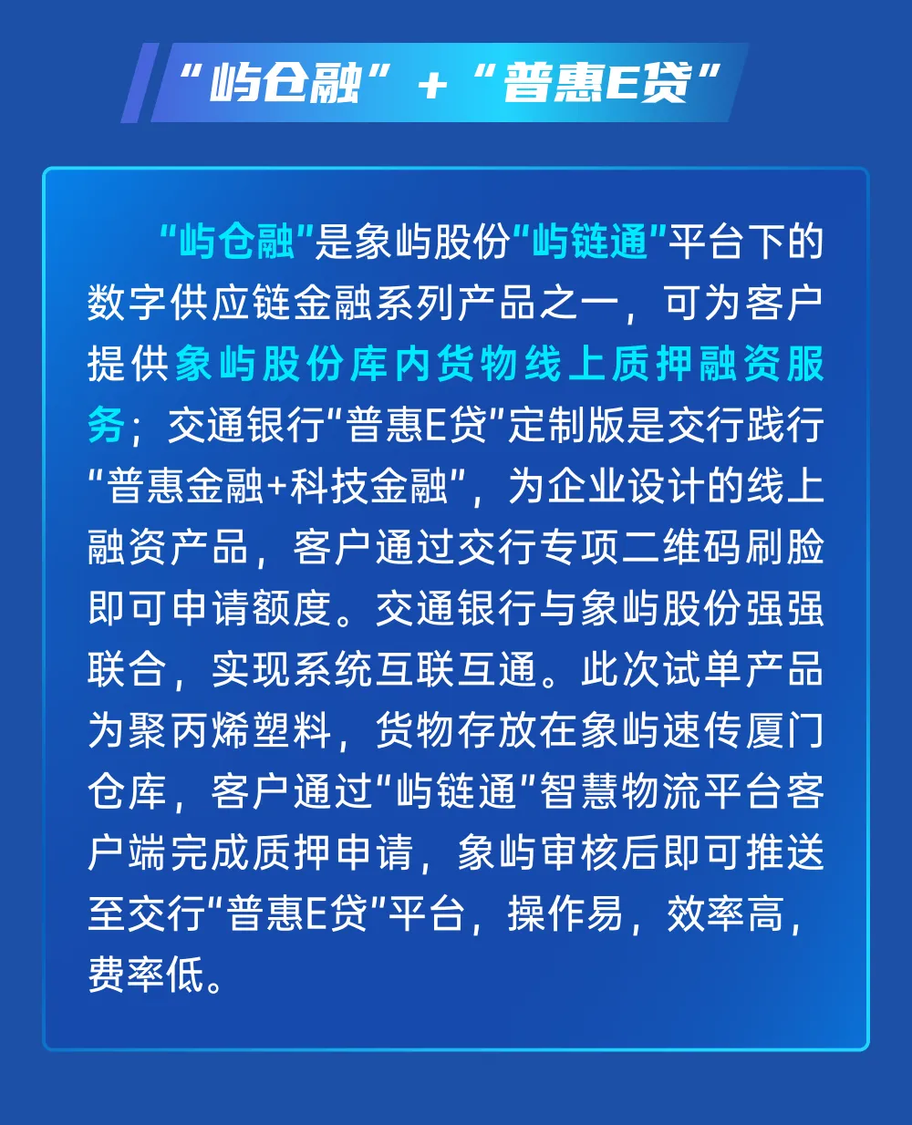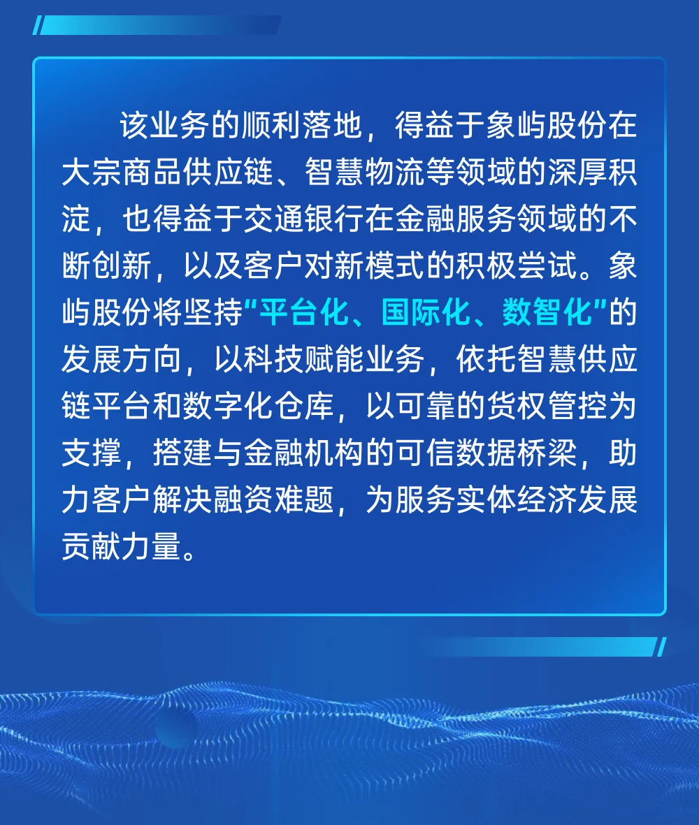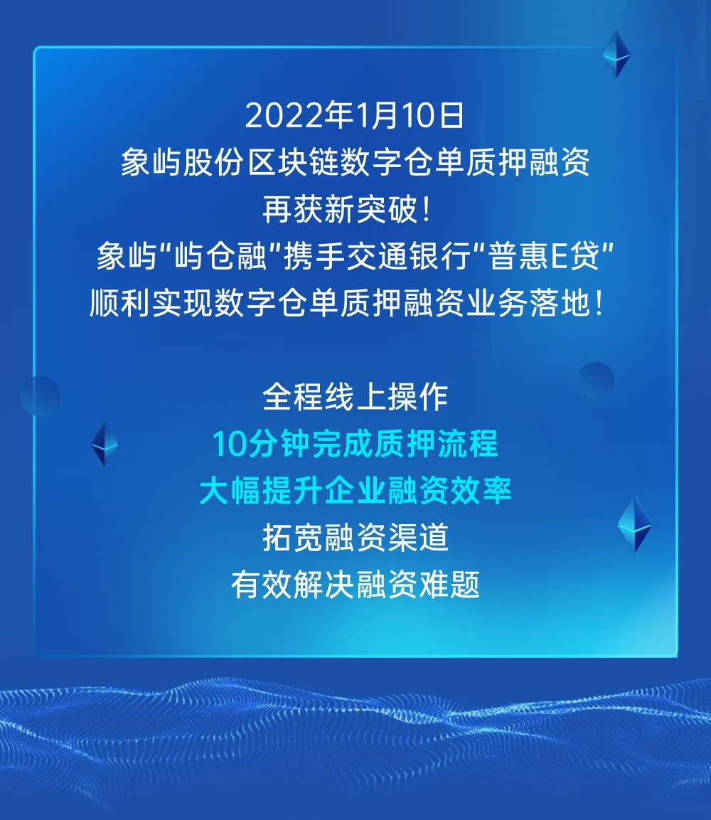 象嶼“嶼倉融”助力交行“普惠E貸”數(shù)字倉單質(zhì)押融資業(yè)務成功落地!