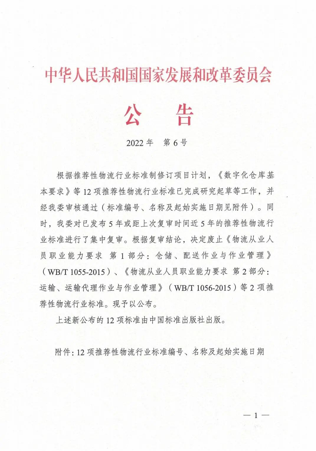近日,中華人民共和國(guó)國(guó)家發(fā)展和改革委員會(huì)印發(fā)了2022年第6號(hào)公告,批準(zhǔn)發(fā)布12項(xiàng)推薦性物流行業(yè)標(biāo)準(zhǔn)。其中,由廈門象嶼股份有限公司參與編寫(xiě)的《數(shù)字化倉(cāng)庫(kù)基本要求》(WB/T 1118-2022)《數(shù)字化倉(cāng)庫(kù)評(píng)估規(guī)范》(WB/T 1119-2022)2項(xiàng)推薦性物流行業(yè)標(biāo)準(zhǔn)于2022年7月1日正式實(shí)施。